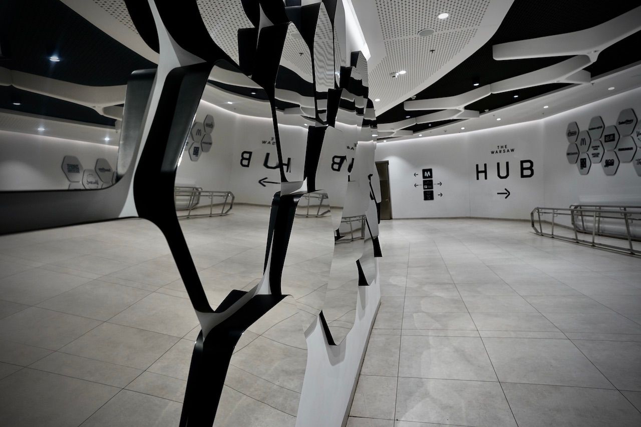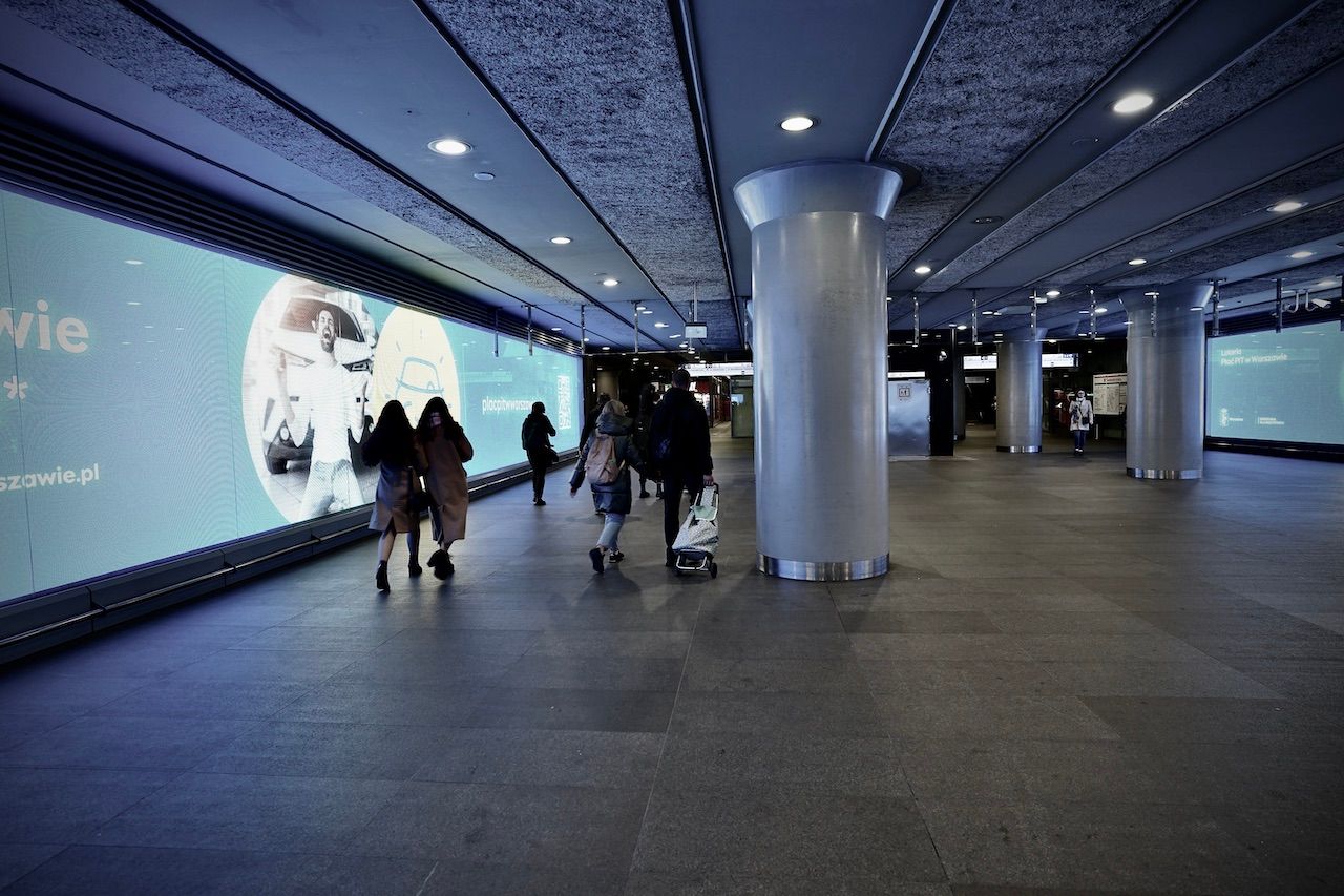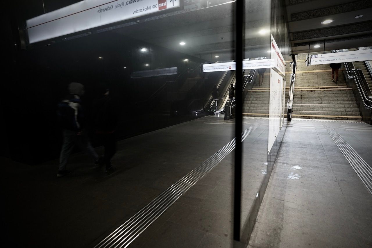 Sheltering from the rain, descending into the bowels of the Warsaw Metro. Criss-crossing streams of people, bright lights and mirrored walls. A sense of calm and order. A clash of commerce and community.