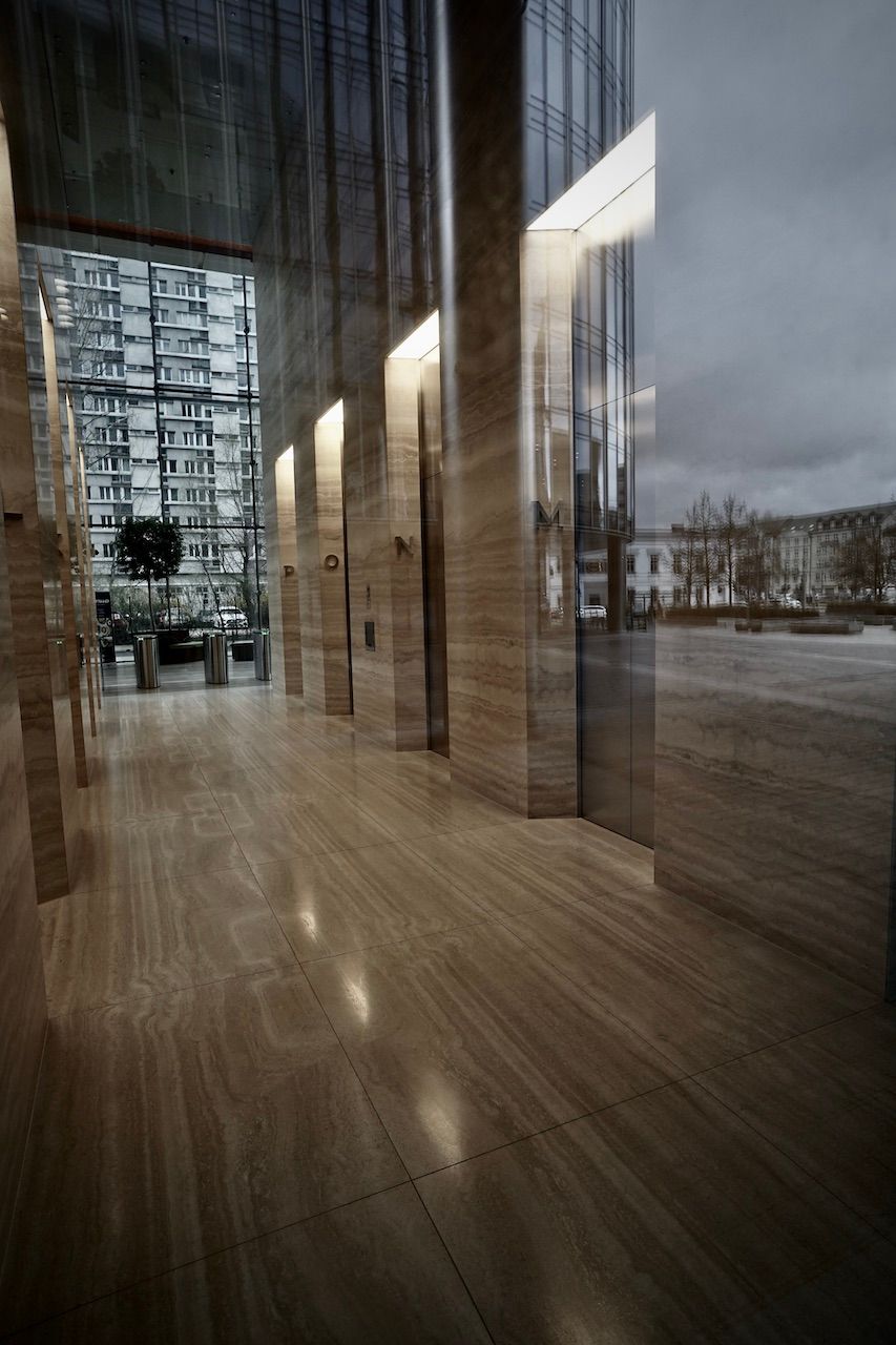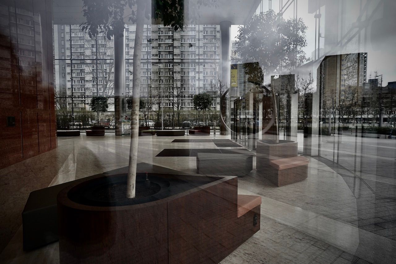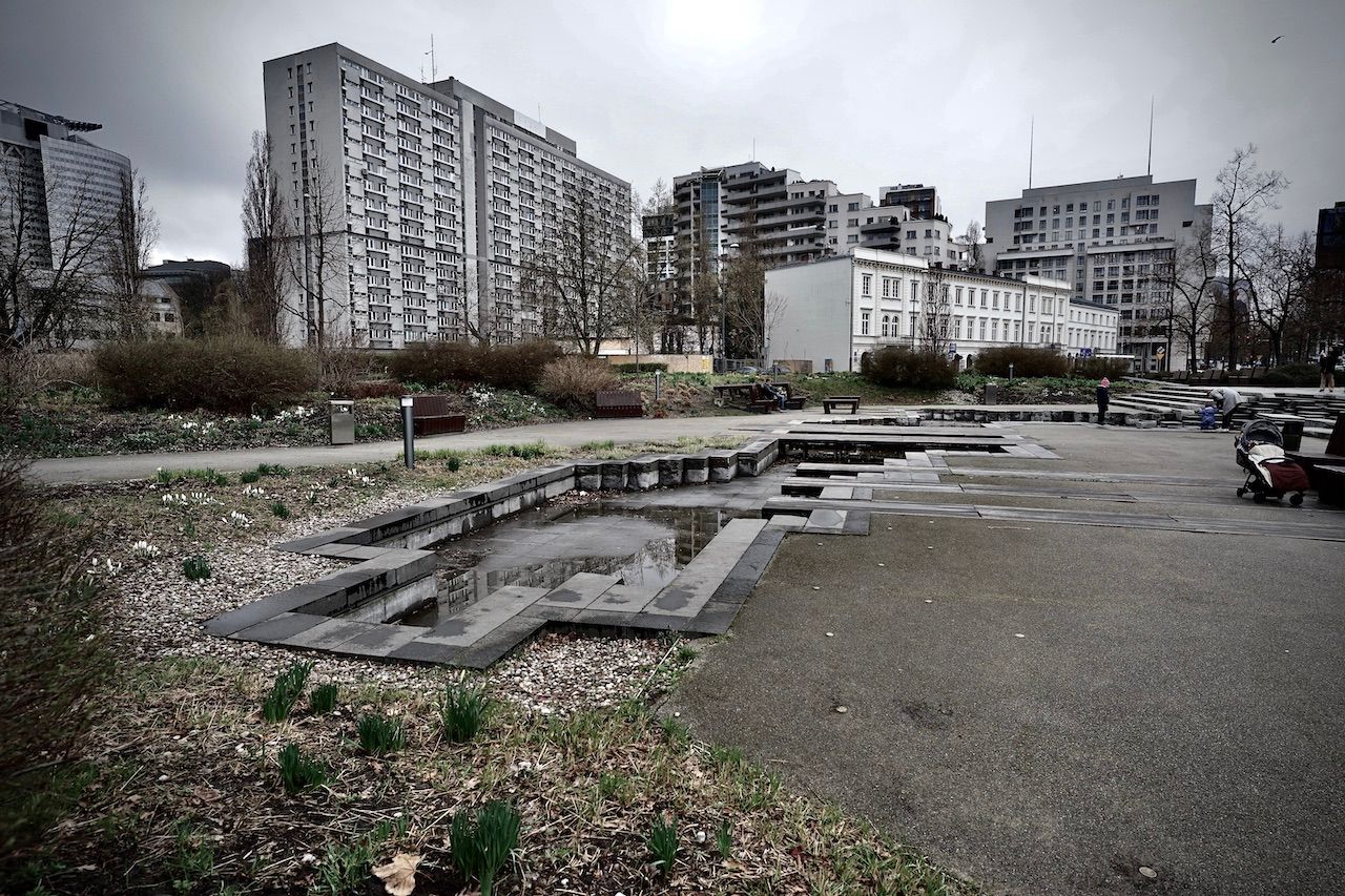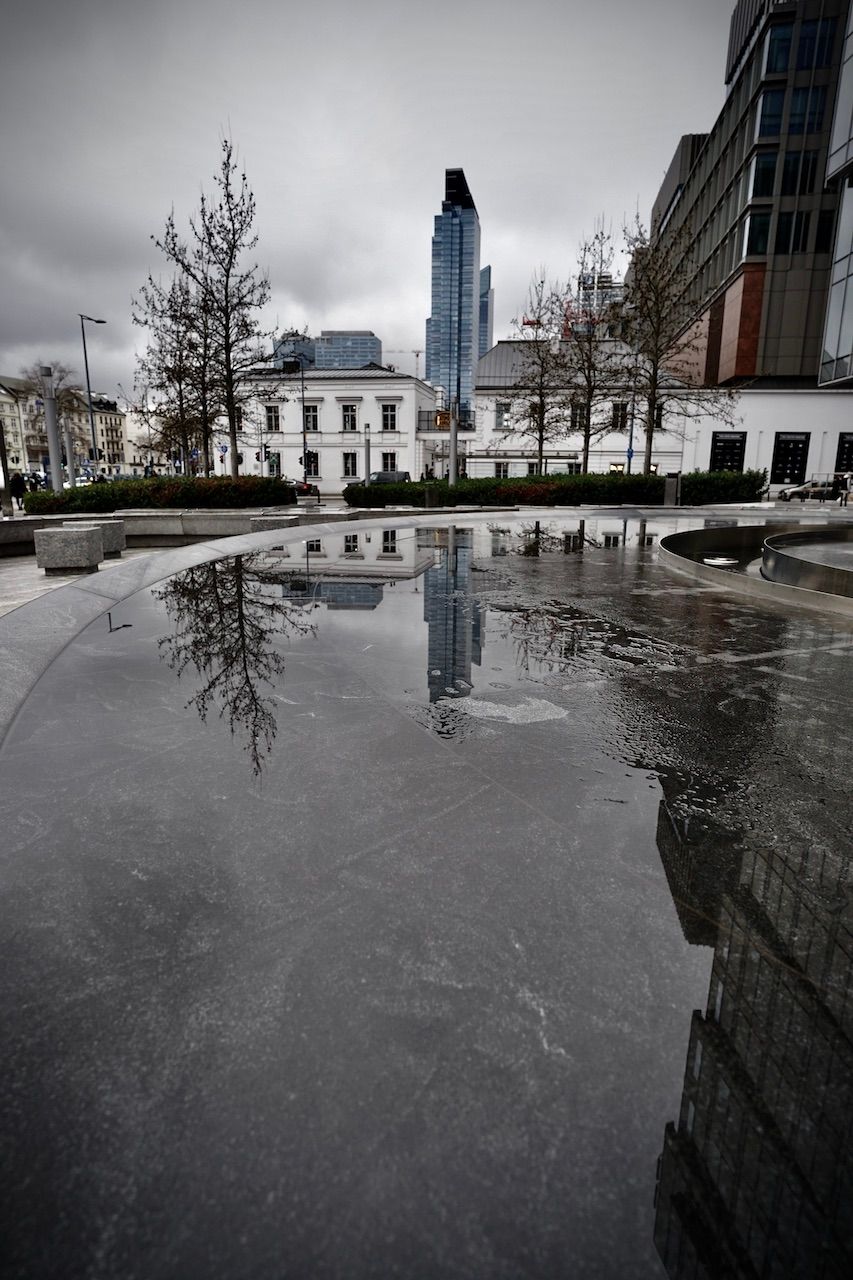 Spring struggles to force its colour in the foliage surrounding The Warsaw Spire. Dry fountains yawn under the stares from monolithic towers. A myriad of reflections, of views merely glimpsed through eyes forced narrow by the wind.