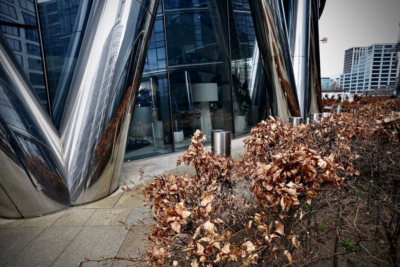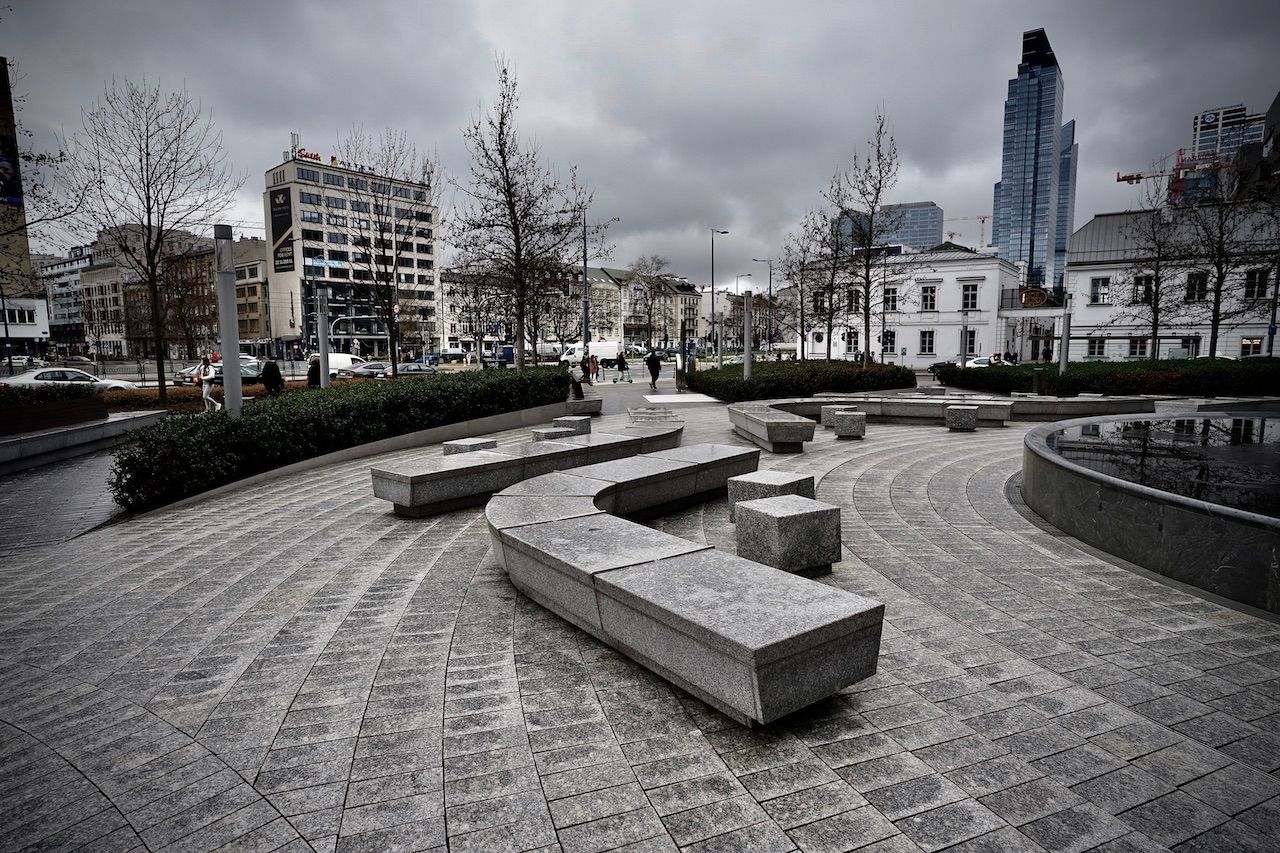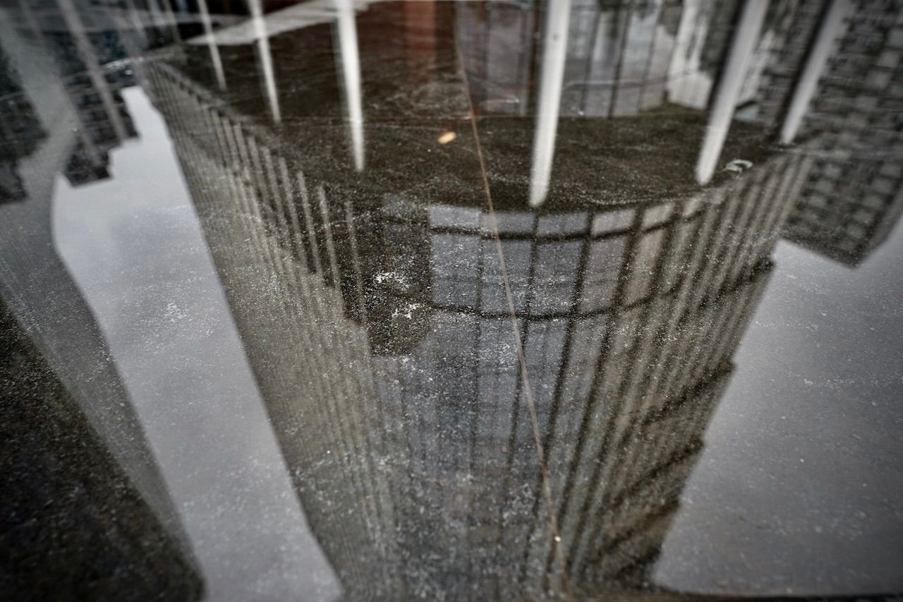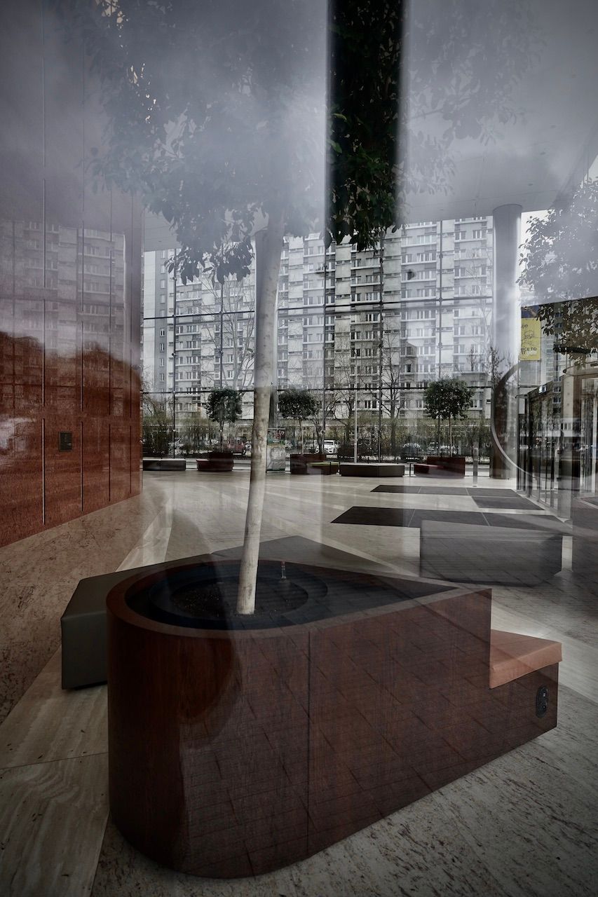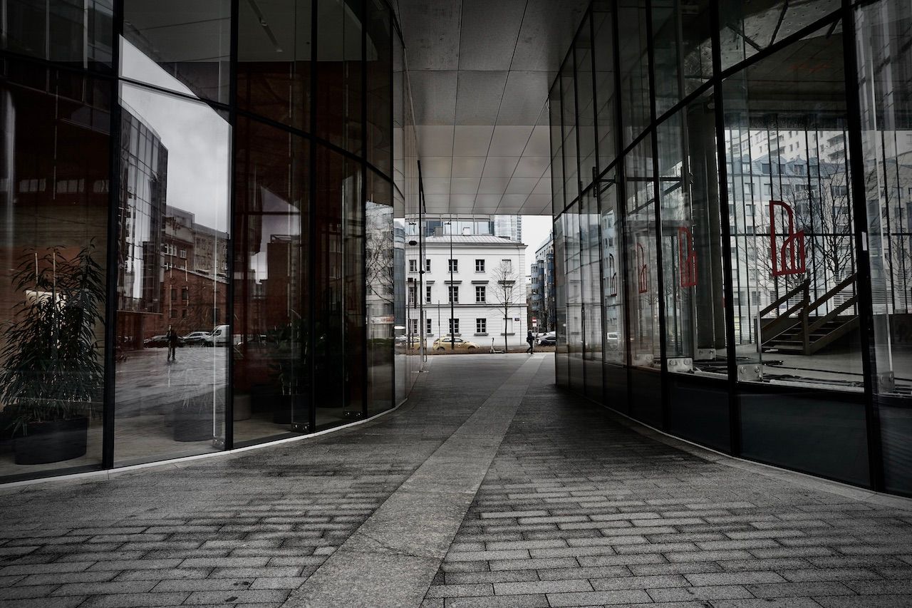 Spring struggles to force its colour in the foliage surrounding The Warsaw Spire. Dry fountains yawn under the stares from monolithic towers. A myriad of reflections, of views merely glimpsed through eyes forced narrow by the wind.