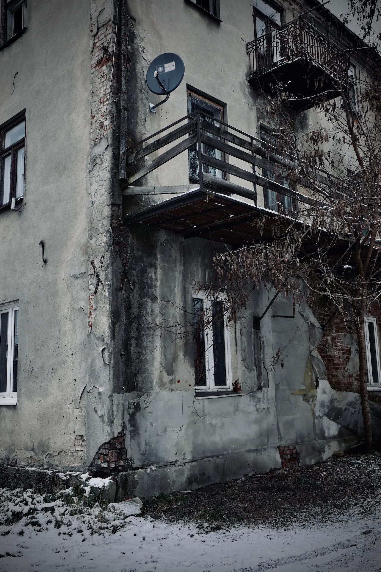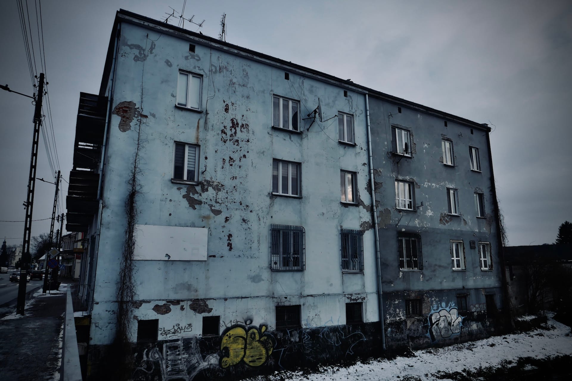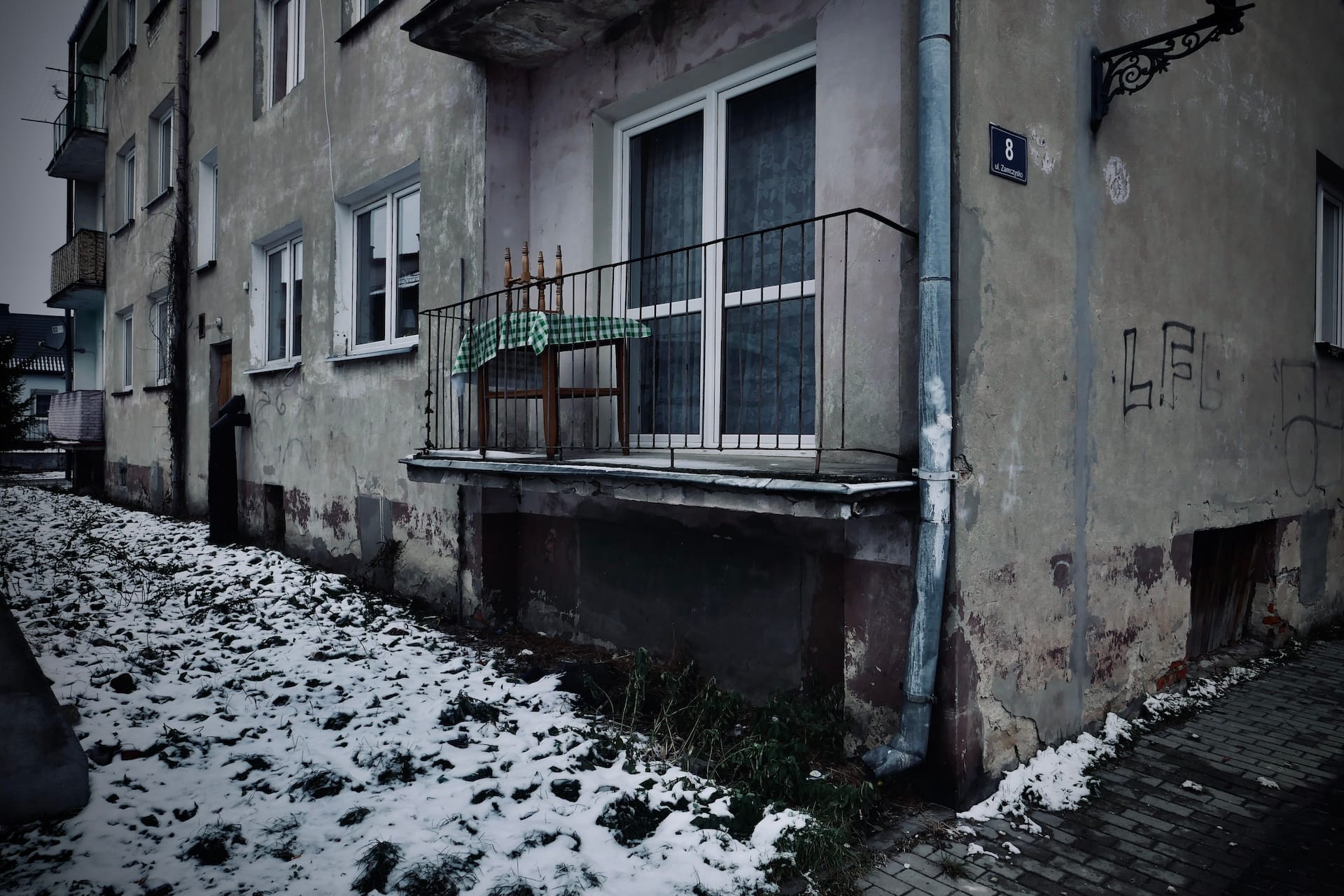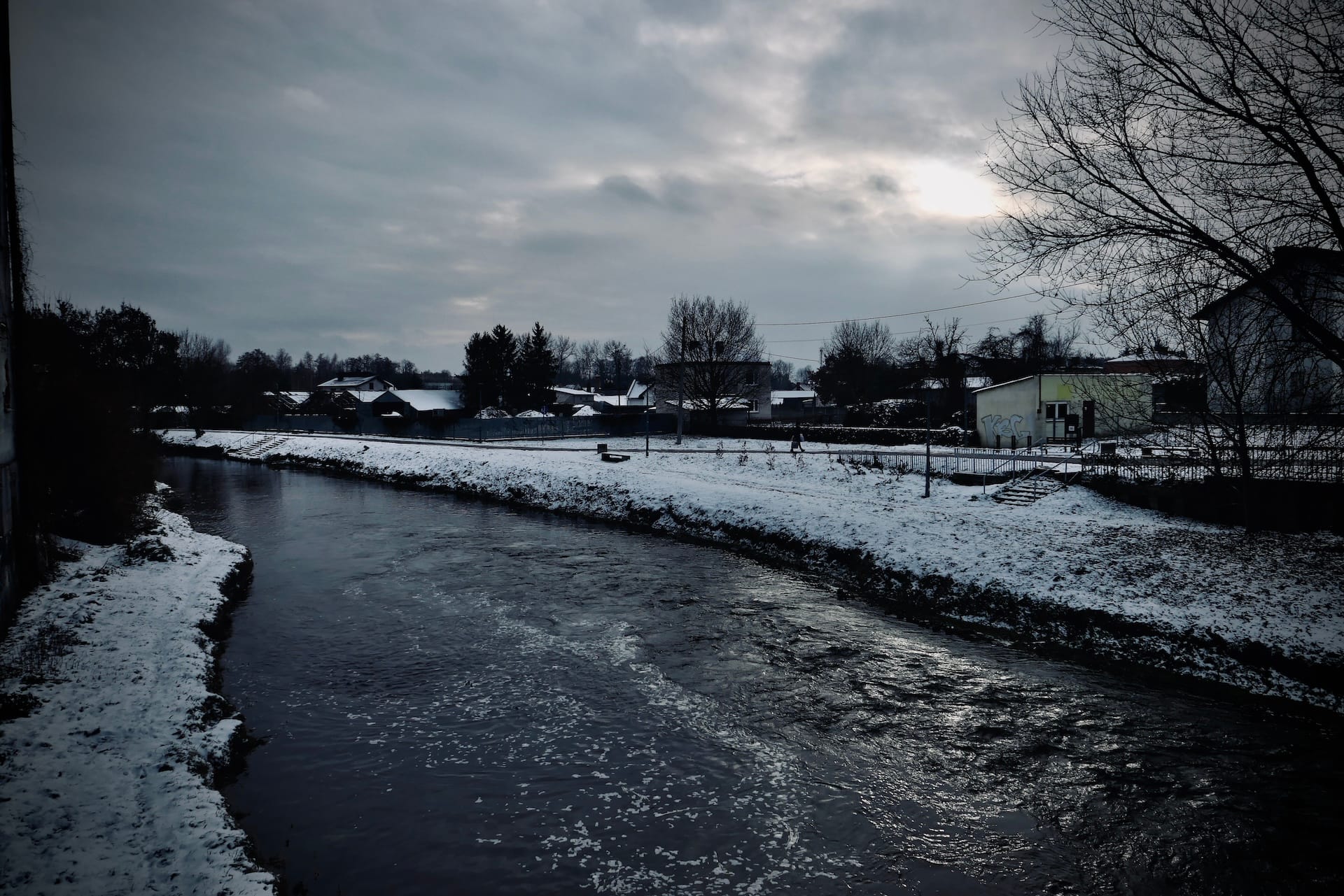Crossing the river and looking back at the town it seems almost frozen in time. Its drab colours and dilapidated buildings convey a deep sense of unease and guilt.